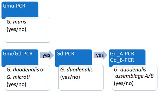 To further identify and distinguish zoonotic assemblages A and B, we used a real-time PCR assay developed by Vanni et al. 2012 [] and modified by Pijnacker et al. 2016 []. Using these five PCR approaches allowed us to identify all three Giardia species and zoonotic assemblage types (see the workflow in Figure 2).