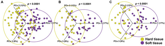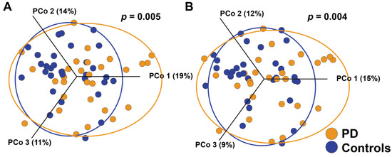 | PD (n = 30) | Controls (n = 30) | p-Value † | Jaccard p-Value | Bray-Curtis p-Value | Weighted Unifrac p-Value | Unweighted Unifrac p-Value | |