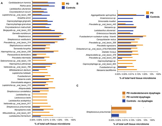 - Mihaila, D.; Donegan, J.; Barns, S.; LaRocca, D.; Du, Q.; Zheng, D.; Vidal, M.; Neville, C.; Uhlig, R.; Middleton, F.A. The oral microbiome of early stage Parkinson’s disease and its relationship with functional measures of motor and non-motor function. PLoS ONE 2019, 14, e0218252. [Google Scholar] [CrossRef]