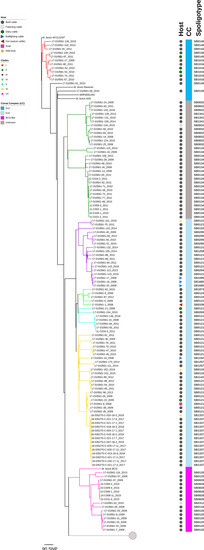 Additionally, the sequences from Catalonia were compared against a global set of 637 M. bovis isolates obtained from public repositories (https://www.ncbi.nlm.nih.gov/sra/, accessed on 29 July 2021). From previous publications regarding WGS analysis of M. bovis, a search was performed in NCBI’s Sequence Read Archive to obtain the sequences. Supplementary File S2 contains the list of accessions for the global data set used in this analysis and provides information such as year of isolation, host, and country of origin, which was obtained from the publications associated with the sequences or through direct contact with the submitters.