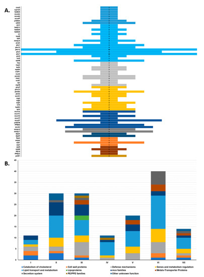 In this respect, Clade VI presented by far the higher number of variants than the other clades (Figure 5B), and most of this increase was represented by the secretion system category, represented mainly by the secA2 and PPE68 genes. This was the clade with the most isolates, so that might explain the higher number of variants, all of which are nonsynonymous. However, Clade VI also presented the most clusters/subclusters compared to Clades I–V and VII. Studies suggest that the secA2 secretion system, most likely through sodA, inhibits extrinsic and intrinsic apoptosis pathways induced upon mycobacterial macrophages infection and have proposed that it prevents apoptosis and antigen-specific CD8+ cross-presentation, as well as altering the intracellular trafficking in favor of the bacteria [77].