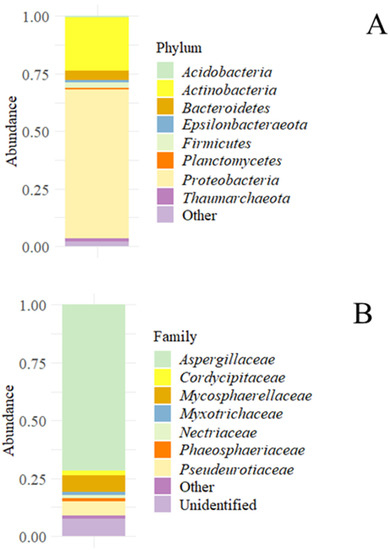 The fastQ sequences analyzed in R provided a total of 70.287 good quality reads for prokaryotes and 86.890 for fungi (NCBI Accession Number PRJNA702109). Considering prokaryotes, at a phylum level, the most abundant populations detected were Proteobacteria (more than 50% of the total reads) and Actinobacteria (around 25%); furthermore, some Archaea, as Thaumarchaeota, were also found (Figure 1A). Regarding the fungal populations found in the sample, they were dominated by almost 75% at the family level by Aspergillaceae; the remaining the population was formed by Phaeosphaeriaceae, Pseudeurotiacee, and other unidentified families (Figure 1B).