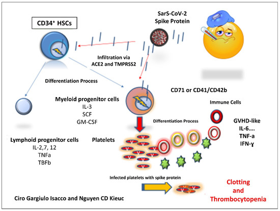 Nevertheless, the mechanism of Sars-CoV-2 infection is well understood and could presumably work for any types of cells. The binding between the viral surface spike glycoprotein (S) and target cell surface takes place via the angiotensin-converting enzyme-2 (ACE2), followed by the cleavage of S by the transmembrane protease serine 2 (TMPRSS2). Several research teams observed that this mechanism via ACE2 could also be observed in intestinal epithelial cells, hepatocytes, and neurons, which explains the multiplicity of symptoms that characterize COVID-19 disease [13,14]. Since recently, an aberrant increase in erythroid progenitors together with an aberrant decrease in platelets circulation has been showed either in critical hospitalized cases or after receiving the vaccine shot. Indeed, these observations together with hypoxia, hypocapnia, alkalosis, iron anemia, and coagulopathies were seen highly correlated with an alarming grade of death risk [15,16,17]. Of note, progenitors of the erythroid and myeloid lineage appear to be the only cell types expressing both ACE2 and TMPRSS2 among the cells present in bone marrow. Medical reports from COVID-19 patients showed an increased mean platelet volume (MPV) and platelet hyperactivity, which were occasionally associated with a decrease in the overall platelet count. In our experience, detectable Sars-CoV-2 RNA in the blood stream was associated with platelet hyperactivity in critically ill patients.