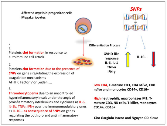 Although they provided clear evidence suggesting the role of the MAPK pathway, downstream of ACE2, enhancing the magnitude of Sars-CoV-2 on platelet activation, in releasing coagulation factors, inflammatory factors, and in the formation of leukocyte–platelet aggregates, we assume otherwise that this is not comprehensive. In fact, the coagulation process was well described by Di Castelnuovo and colleagues referring to the hypercoagulable condition as a possible pathogenic mechanism contributing to disease progression and lethality in COVID-19 hospitalized patients [18]. The insurgence of rare thrombosis events either in COVID-19 affected patients or in post-vaccinated individuals needs further consideration. In our opinion, four factors should be considered: (i) the formation of the “abnormal” platelet progenies from Sars-CoV-2-infected myeloid megakaryocytes which become targets of host immunity (T cells, Th1, NK cells, macrophage M-1); (ii) the presence of single nucleotide polymorphisms (SNPs) on genes regulating the coagulation cascade such as MTHFR and Leiden-factor V; (iii) SNPs at the level of genes regulating the expression of both pro-inflammatory responses (IL-6, TNFα, IFNγ) and immune-modulatory responses (IL-10); (iv) fast platelets turnover with an average lifespan of 8–10 days (Figure 1 and Figure 2).