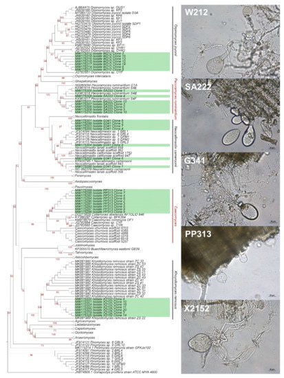 - Joshi, A.; Lanjekar, V.B.; Dhakephalkar, P.K.; Callaghan, T.M.; Griffith, G.W.; Dagar, S.S. Liebetanzomyces polymorphus gen. et sp. nov., a new anaerobic fungus (Neocallimastigomycota) isolated from the rumen of a goat. MycoKeys 2018. [Google Scholar] [CrossRef] [PubMed]