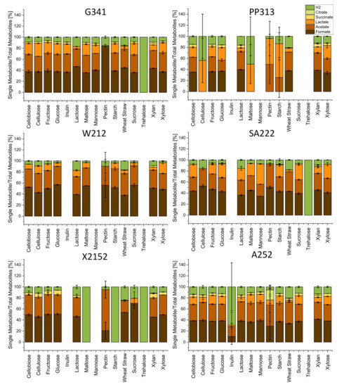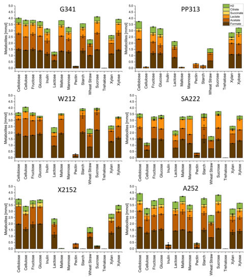 Metabolite production by strain W212 and G341 followed a similar pattern. Hydrogen increased significantly while growing on straw (0.375 mmol) in comparison to monosaccharides (0.097–0.194 mmol) despite a lesser number of total metabolites (2.312 mmol vs. 3.271–3.608 mmol) being produced. On straw lactate amounted to 6.2%, while acetate and formate yielded in 39.3% and 37.7% of the total metabolites, respectively. In comparison, cultivation with monosaccharides resulted in increased formate (48.3–56.8%) and decreased acetate (29.0–33.34%) levels. The relative lactate amount spanned a range between 6.4% (glucose) and 19.7% (xylose) and seemed to be increasing with the decreasing relative amount of formate. As described above, succinate could not be detected for W212.