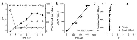 (a) Growth of P. agglomerans in NBRIP medium containing 5 g/L tri-calcium phosphate [Ca3(PO4)2]. Changes in soluble P, bacterial cell growth, and medium pH are reported; values of three independent readings are showed. (b) Relationship between soluble-P and bacterial growth; Pearson correlation p-values and R2 are reported in the graph. (c) Relationship between modification in pH and bacterial growth/soluble-P.