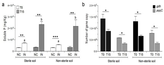 (a) Soluble P in P. agglomerans inoculated sterile and non-sterile soil at 0 and 15 days. NC: uninoculated soil; IN: inoculated soil; 0: day of the inoculum; 15: 15 days after inoculation; t-student test was performed to compare NC and IN at each time and different soils; statistically significant differences are indicated with the asterisks (**, p < 0.01; ***, p < 0.001). ANOVA multi-comparison was also performed to evaluate changes in NC and IN due to the treatment; different letters indicate significant differences (p < 0.01). (b) Quantification of the gdh and pqqC genes in sterile and non-sterile soils inoculated with P. agglomerans at 0 and 15 days; t-student test was performed to compare number of genes at 0 (T0) and 15 (T15) days for each gene (*, p < 0.05).