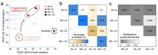(a) Principal coordinate analysis (PCoA) of soil bacterial community structure of control and P. agglomerans-inoculated soil collected at 0 days and 15 days. Variance explained by each PCοA axis is given in parentheses. (b,c) Heatmaps showing the average values of similarity (%) and PERMANOVA p-values of pairwise comparisons across samples categories, respectively. NC: control; IN: inoculated; 0: 0 day; 15: 15 days.