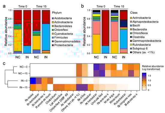 Percentage of relative abundance of bacterial (a) phyla, (b) classes, and (c) genera in control (NC) and P. agglomerans inoculated (IN) soils samples at 0 and 15 days. Relative abundance of genera is reported as log-transformed. For each treatment values are expressed as the average of the three replicates.