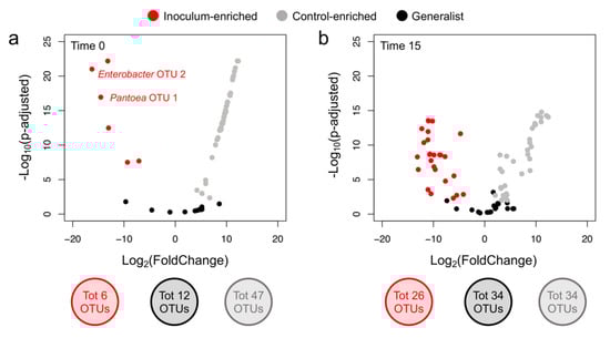 (a,b) Volcano plots showing the OTUs with differential abundance across treatment (control and inoculated) at 0 and 15 days, respectively. Number of OTUs showing similar relative abundance across treatment (generalist) and that are enriched in control or inoculated soils (control-enriched and inoculum-enriched, respectively) are reported; number of OTUs within these three categories is also reported.