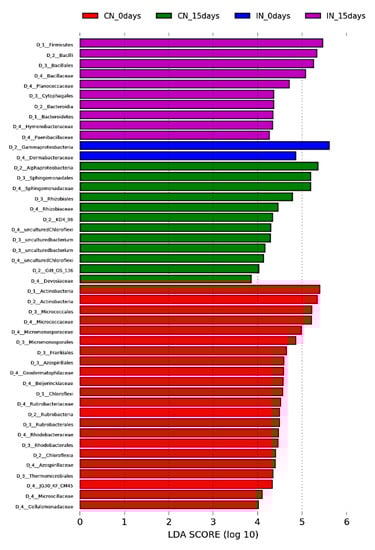 Linear discriminant analysis (LDA) scores of differentially abundant taxa in P. agglomerans inoculated and control sample. The LDA score indicates the effect size and ranking of each differentially abundant taxon.
