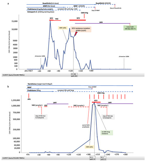 Case 2: A 48-year-old CMV-IgG- and IgM-negative female received a KTx from a deceased CMV-IgG-positive donor. Shortly after transplantation, the patient was treated with anti-thymocyte globulin and immunoadsorption due to the acute rejection. As the patient had shown progressive leukopenia after KTx even before rejection therapy, VGC therapy was discontinued and CMV PCR was monitored weekly. In the further course, leukopenia normalized and prophylactic therapy with VGC was re-initiated but had to be paused after 3 days because of recurrent leucopenia. At week 6 post-KTx, blood screening revealed a positive CMV PCR. The recurrence of leukopenia after initiation of therapeutic VGC therapy led to the decision of changing therapy to LMV (480 mg once daily) and to pause VGC therapy. Stable CMV clearance was gained after 42 days of therapy (two negative PCR tests within two weeks). Therapy was switched back to prophylactic VGC (450 mg/d, adapted to eGFR). One hundred and ninety-one days post-KTx, PCR testing for CMV DNA revealed 77,000 copies, and the patient presented with diarrhea as a clinical symptom of CMV-associated colitis. Due to severe leukopenia, VGC therapy was discontinued, and CMV IVIg therapy was instituted (100 IE/kg body weight); however, the viral load increased to >1,000,000 copies in a few days. Consequently, the patient was hospitalized, immunosuppression with mycophenolate mofetil (MMF) was stopped, and additional treatment with intravenous GCV initiated. Because of the life-threatening clinical situation, rising CMV levels and weak CMV T-cell reactivity by ELISPOT, LMV was introduced again as an add-on therapy. The resistance analysis of CMV against VGC/GCV was negative. A triple combination therapy led to a rapid decrease in CMV viremia. GCV was replaced by oral VGC, but VGC treatment again resulted in leukopenia. Under current medication, consisting of LMV (480 mg) and CMV-IVIg, sustained clearance of CMV viremia was achieved. LMV therapy is continued to date (Figure 1b).