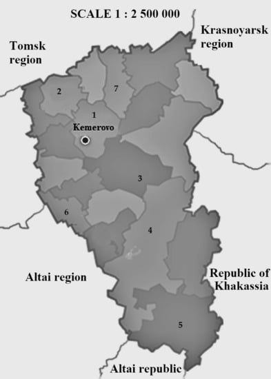 Places of microorganism sample collection: collection zone 1—Kemerovsky District, collection zone 2—Yashkinsky District, collection zone 3—Chebulinsky District, collection zone 4—Novokuznetsky District, collection zone 5—Tashtagolsky District, collection zone 6—Guryevsky District, collection zone 7—Izhmorsky District.