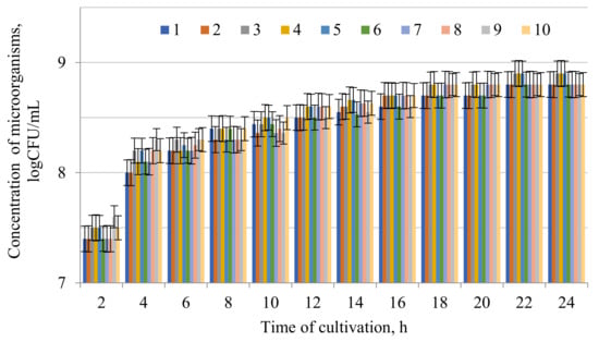 Growth of isolated microorganisms: 1—EM1, 2—EM2, 3—EM6; 4—EM7, 5—EM11, 6—EM12, 7—EM13, 8—EM15, 9—EM16, 10—EM7. Data presented as a mean ± SD (n = 3). The initial concentration was 6.0 × 103.
