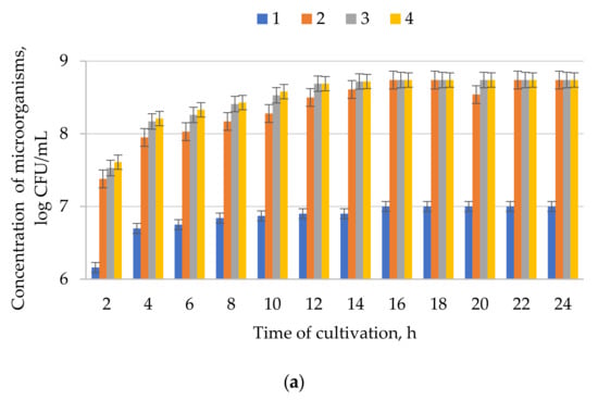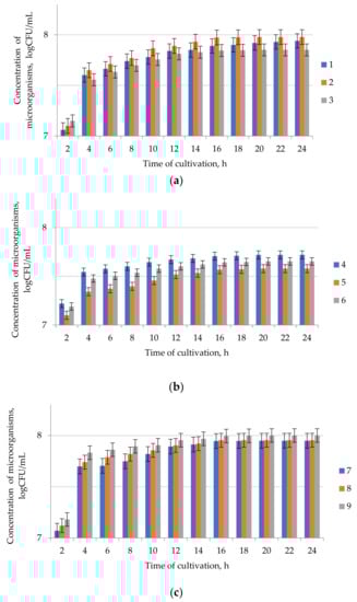 The results of evaluating the viability of consortia during their cultivation on nutrient media containing microalgae hydrolyzate are shown in Figure 4.