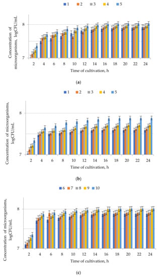 The study [47] examined the maximum specific growth rate of Brochothrix thermosphacta, the spoilage bacteria of cooked peeled shrimp, and Lactococcus piscium CNCM I-4031, a bioprotective strain, at various temperatures. It was found that L. piscium and B. thermosphacta were psychrotolerant, with T(min) = −4.8 and −3.4 °C, respectively, T(opt) = 23.4 and 27.0 °C, respectively, and T(max) = 27.2 and 30.8 °C, respectively. At an optimal temperature, the maximum concentration of microorganisms reaches values of 1 × 107–1 × 108 CFU/mL. The differences in the temperatures of the maximum concentration of microorganisms with the data obtained in our study are explained by the different types of studied microorganisms. The maximum concentration of microorganisms in our study was 10.5 × 108 CFU/mL, 7.5 × 108 CFU/mL, and 10.2 × 108 CFU/mL.