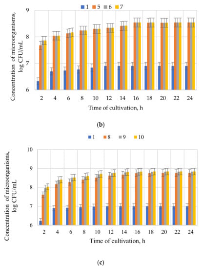 Dependence of the concentration of microorganisms in consortia (a) I, (b) II, and (c) III on the cultivation duration on different nutrient media with added microalgae: 1—control (no added microalgae hydrolysate), 2—medium 10, 3—medium 11, 4—medium12, 5—medium 13, 6—medium 14, 7—medium 15, 8—medium 6, 9—medium 17, 10—medium18. The initial concentration was 5.8 × 103, 6.0 × 103, 5.7 × 103 for consortia I, II, and III, accordingly. Data presented as a mean ± SD (n = 3).