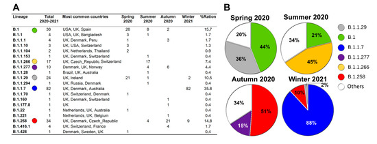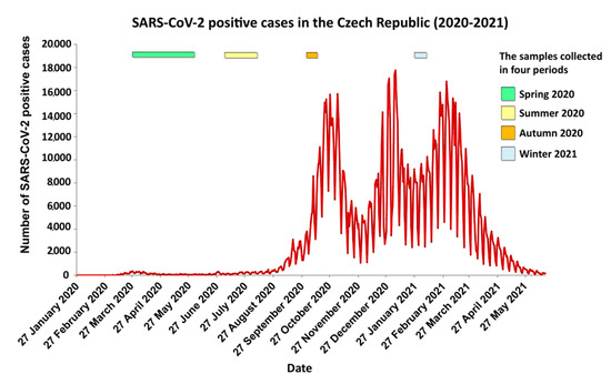 Klempt, P.; Brzoň, O.; Kašný, M.; Kvapilová, K.; Hubáček, P.; Briksi, A.; Bezdíček, M.; Koudeláková, V.; Lengerová, M.; Hajdúch, M.; et al. Distribution of SARS-CoV-2 Lineages in the Czech Republic, Analysis of Data from the First Year of the Pandemic. Microorganisms 2021, 9, 1671. https://doi.org/10.3390/microorganisms9081671