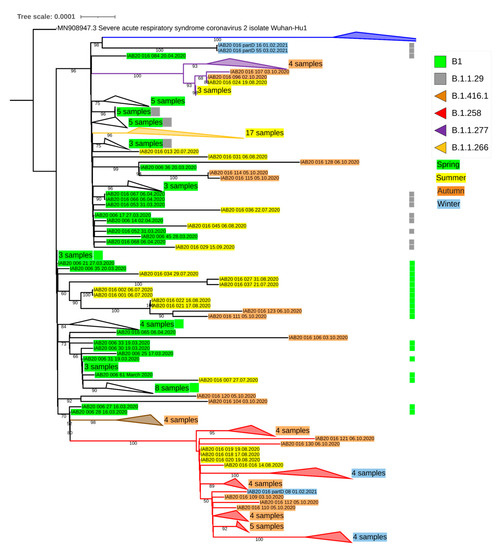 - Rambaut, A.; Holmes, E.C.; O’Toole, Á.; Hill, V.; McCrone, J.T.; Ruis, C.; du Plessis, L.; Pybus, O.G. A dynamic nomenclature proposal for SARS-CoV-2 lineages to assist genomic epidemiology. Nat. Microbiol. 2020, 5, 1403–1407. [Google Scholar] [CrossRef] [PubMed]