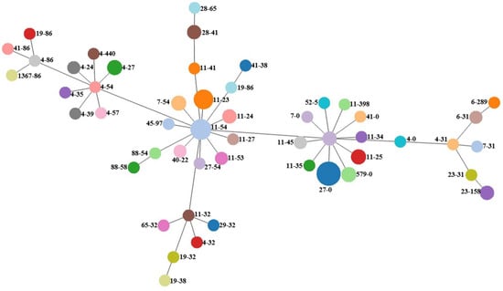 goeBURST diagram for the CH clonotyping dataset of E. coli isolates. An eBURST diagram was calculated using PHYLOViZ with the goeBURST algorithm. E. coli isolates were grouped according to their CH profiles.