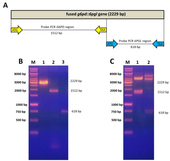 Amplification of the fused g6pd::6pgl gene and the individual g6pd and 6pgl regions. (A) Schematic representation of fused g6pd::6pgl gene from G. lamblia, and the individual of g6pd and 6pgl regions. (B) PCR products of amplification. Lane 1: PCR product of fused g6pd::6pgl. Lane 2: PCR product of the individual g6pd region. Lane 3: PCR product of the separate 6pgl region. (C) Digestion of the pJET1.2/blunt-g6pd (lane 1), y pJET1.2/blunt-6pgl (lane 2) plasmids with NdeI y BamHI restriction enzymes. In both gels, GeneRuler 1Kb Plus DNA (Termo Scientifc®) was used as a molecular weight marker (M).