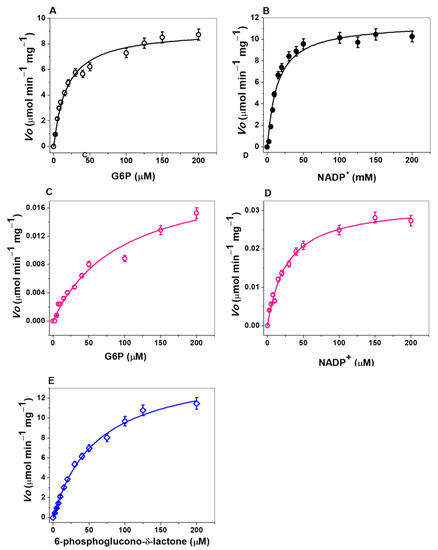 Michaelis–Menten plots for G6PD domain of fused G6PD::6PGL enzyme with (A) G6P and (B) NADP+ as substrates. Michaelis–Menten plots for individual G6PD protein with (C) G6P and (D) NADP+ as substrates. Michaelis–Menten plots for 6PGL domain of fused G6PD::6PGL with (E) 6-phosphoglucono-δ-lactone substrate. The data represent the mean ± SD from five independent experiments.