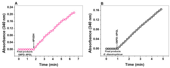 Determination of the catalytic activity of the 6PGL domain of the fused protein by coupled assay. (A) Evaluation of the final product of the catalysis of the fused G6PD::6PGL enzyme by coupled assay with the 6PGDH enzyme from G. lamblia. (B) The final product of the enzymatic reaction is catalyzed by the recombinant G6PD enzyme from G. diazotrophicus and coupled with the fused G6PD::6PGL enzyme.