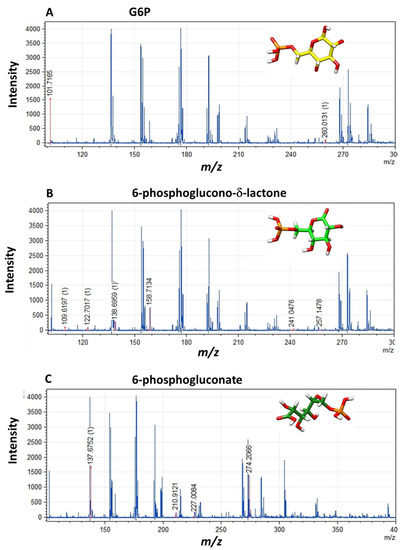 Mass spectra of the metabolites identified in the final product of the catalytic reaction of the fused G6PD::6PGL enzyme by MALDI-TOF MS. (A) Mass spectrum of the substrate glucose 6-phosphate, (B) 6-phosphoglucono-δ-lactone, (C) 6-phosphogluconate. Each peak corresponds to the masses of the fragmented metabolites ions present in the reaction of the G6PD::6PGL enzyme from G. lamblia. The experiment was performed in triplicate.