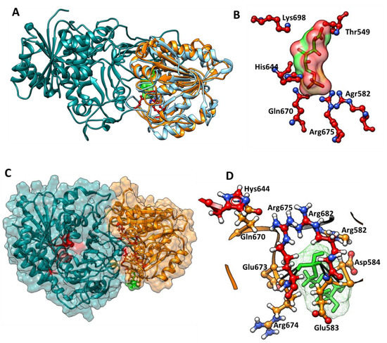 To predict the amino acids involved in the binding site of 6-phosphoglucono-δ-lactone on the 6PGL domain of the G6PD::6PGL from G. lamblia, the 3D model of the G6PD::6PGL was aligned with the crystallographic structure of 6-phosphogluconolactonase from Trypanosoma brucei complexed with 6-phosphogluconic acid (PDB: 3E7F) [14]. The Tb6PGL showed a 27% sequence identity with the G6PD::6PGL from G. lamblia. The alignment and the root mean square deviation (RMSD) value of 1.647 Å was obtained for 202 Cα atoms, and the Q-score value was 0.563 (Figure 7A). For 6-phosphoglucono-δ-lactone, the key binding site residues Thr549, Arg582, His644, Gln670, Arg675, and Lys 698 were selected (Figure 7B).