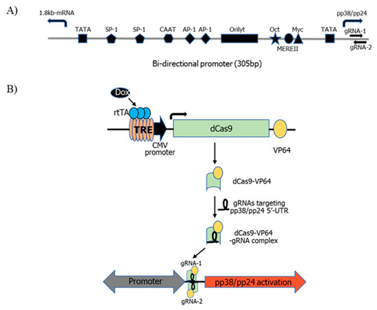 Because of the rapid induction during lytic infection from an almost complete absence of expression during the latent phase, MDV-encoded phosphoproteins pp38 and pp24 are widely considered as biomarkers for lytic switch of infection [9]. pp38 and pp24, which share the 65 N-terminal amino acids, are encoded from genes located at the junction of the unique long (UL) and the repeat long (RL) regions of the MDV genome and flanked with an MDV origin of lytic replication (OriLyt) [10,11,12]. Transcription of pp38 and pp24 genes is regulated by the bidirectional promoter-enhancer of the 1.8 kb gene family [13]. Previous studies have shown that pp38 is essential for the lytic infection of B-cells, while it was dispensable for lytic infection of the epithelial cells of feather follicles or the induction of tumours [14]. A recent study has also demonstrated that pp38/pp24 can be deleted from LCLs without affecting MDV latency or cell proliferation, although this study did not examine the ability of the mutant LCL to switch to lytic infection [15]. While global epigenetic modifiers such as HDAC and DNA methylase inhibitors can be used for initiating lytic infection, these treatments have broader effects on the cell and therefore are not useful to examine the direct role of pp38/pp24 in the lytic switch. We have employed a robust CRISPR activation (CRISPRa) strategy for precise targeted activation of pp38/pp24 expression in LCLs to examine its direct role in the switch to lytic infection.