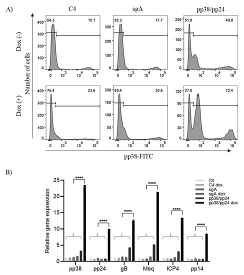 To examine the effect of pp38/pp24 on the lytic switch of MDV in a latently infected MDV cell line through activation of pp38/pp24 expression by CRISPRa, we first established a 4523T cell line stably expressing Tet-inducible dCas9-VP64 via transfection of pHAGE-TRE-dCas9-VP64 into 4523T cells followed by geneticin selection and single cell cloning. A purified C4 clone was selected to study pp38/pp24 activation by CRISPRa. It has been reported that the region of −400 to −50 bp upstream from the transcription start site (TSS) is a peak window of active gRNAs for CRISPRa [28]. However, the activity of gRNAs targeting the 5′-UTR of the gene has also been shown to be effective in the CRISPRa system [28,29]. We tested the CRISPRa activity of two high-scoring gRNAs located at the 5′-UTR of pp38/pp24 designed using the gRNA designing tool CRISPOR due to the lack of good quality gRNA candidates at the promoter region. The schematic representation of the bidirectional promoter driving pp38/pp24 and 1.8 kb-mRNA with the location of gRNAs for CRISPRa and CRISPRa Tet-On dCas9 VP64 system for doxycycline-inducible pp38/pp24 activation are illustrated in Figure 1. The two gRNAs targeting the 5′-UTR of pp38/pp24 or a non-specific control gRNA sgA were transfected into C4 cells, which were then treated with or without 1 µg/mL doxycycline for 24 h. Upon doxycycline treatment, a reverse tetracycline-controlled transactivator (rtTA) binds to the TRE thereby activating dCas9-VP64 expression, and the dCas9-VP64-gRNA complex induces targeted activation of pp38/pp24 expression. To measure the level of pp38 protein expression in the transfected cells before and after treatment, cells were labelled with pp38-specific antibody BD1 and analysed using FACS.