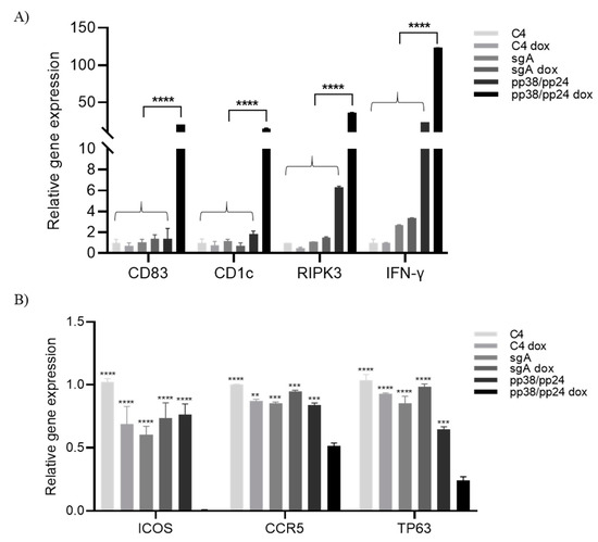 Differential expression of host genes in pp38/pp24-overexpressed C4 cells. RT-qPCR analysis of differential expression of host genes in pp38/pp24-overexpressed population and the control cells. C4 cells were transfected with sgA or pp38/pp24-specific gRNAs in presence (C4 dox, sgA dox and pp38/pp24 dox) or absence of doxycycline (C4, sgA and pp38/pp24). RNA was extracted 24 h pt, followed by RT-qPCR analysis using gene-specific primers. The histogram represents the relative gene expression of host genes in C4 cells. Expression was normalized to the endogenous GAPDH. The relative fold change was compared with C4 cells and expressed as fold change (2−ΔΔCT). (A) Histogram representing upregulation of host gene (CD83, CD1c, RIPK3 and INF-γ) transcripts in C4 cells. (B) Histogram representing downregulation of host gene (CCR5, TP63 and ICOS) transcripts in C4 cells. Asterisk indicates statistically significant differences between pp38/pp24-overexpressing cells and each of the control cells. **, p < 0.01; ***, p < 0.001; ****, p < 0.0001.