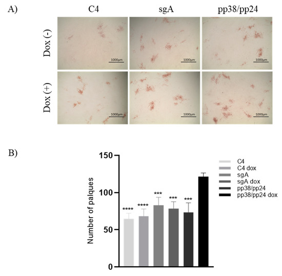 To form the crRNA and tracrRNA complex, equimolar concentrations of crRNA and tracrRNA were mixed in an RNAse-free Eppendorf tube, heated at 95 °C for 5 min and left at room temperature for 10 min. The crRNA-tracRNA complex of either two pp38/pp24 gRNAs or sgA was electroporated into C4 cells, as described in Section 2.2. As pHAGE TRE dCas9-VP64 plasmid contains a tetracycline response element, 1 μg/mL of doxycycline (Dox) was added to the transfected cells for the dCas9-VP64 activation. At 24 h post transfection (pt), cells were harvested for RNA extraction and plaque assay.