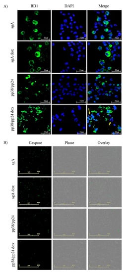 24 h pt, 1 × 105 of gRNA-transfected C4 cells with and without doxycycline treatment were plated into wells of a 96-well plate. Cells were stained with IncuCyte® Caspase-3/7 Green Reagent (Sartorius, Ann Arbor, MI, USA) at 1:1000 dilution for 2 h. The images were captured by label-free high throughput IncuCyte S3 at 4× objective (Sartorius AG, Gottingen, Germany).