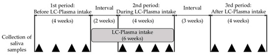 Study design: Four saliva samples were collected during each period, and HHV-6 and HHV-7 DNA loads were measured by real-time PCR. After the 4-week first period, all subjects took Lactococcus lactis strain Plasma (LC-Plasma) for 6 weeks. Two weeks after initiation of LC-Plasma intake (the period required for expression of effects), the subjects entered the second period. After a 3-week washout period, the subjects entered the third period. The black triangles indicate the time points when saliva samples were collected from the subjects.