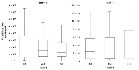 Comparison of mean HHV-6 and HHV-7 DNA loads over the three periods, by subgroup. *: Significantly different between the first and second periods.