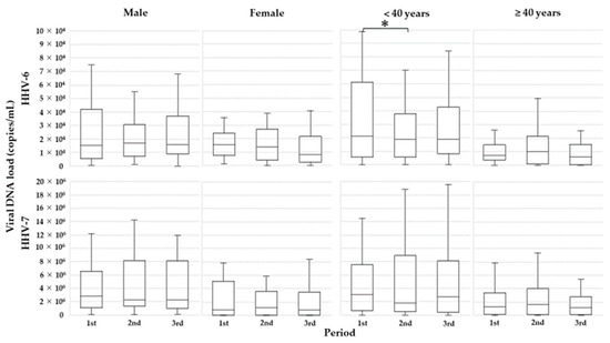 Then, because the initial analyses revealed that age and sex were associated with the levels of salivary shedding of viral DNA, subjects were divided into two subgroups by age (younger age < 40 years old or older age ≥40 years old) or sex (male or female), and subgroup analyses were carried out. In the younger age subjects (n = 25), mean HHV-6 DNA loads were significantly lower in the second period than in the first period (median/IQR, 22,775/9300–60,463 vs. 20,325/6525–38,000 copies/mL; P = 0.020) (Figure 4). Meanwhile, in older subjects regardless of sex, no statistically significant difference in HHV-6 DNA load was detected.