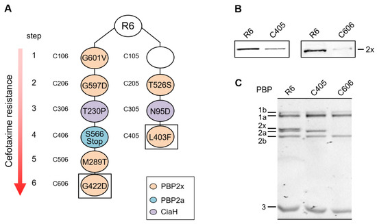Characteristics of C405 and C606 mutants. (A) Cefotaxime-resistant laboratory mutant families C006 and C005 and the occurrence of mutations at each selection step are shown. The first digit of the mutant indicates the selection step, and the last one specifies the mutant family. Mutations identified in PBP2x [19,68], PBP2a [10], and CiaH [36] are shown; the mutation present in C105 is not known. The black squares mark the two mutants C606 and C405, which contain reduced amount of the essential PBP2x. (B) Reduced amounts of PBP2x are detected on immunoblot with an anti-PBP2x antibodies. (C) PBP profile analysis. PBPs in cell lysates were labeled with BocillinTMFL, and SDS-PAGE gel analyses were performed as described in the Materials and Methods section. The positions of PBPs are indicated on the side. The strain names are indicated on top.
