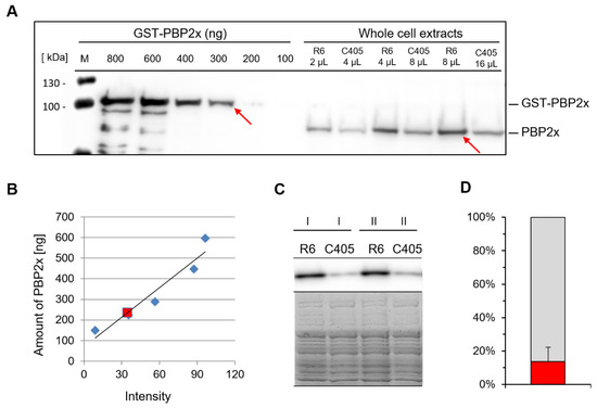 PBP2x is an abundant protein in the parental strain R6. (A) Representative quantitative Western blot used to determine the cellular amount of PBP2x. Left lanes 2–7, purified GST-PBP2x standard at various dilutions (800 ng, 600 ng, 400 ng, 300 ng, 200 ng, 100 ng, respectively); right lines (8–13) native PBP2x detected in different amounts of whole-cell lysates of R6 and C405 strains. M, molecular weight standard. The ODYSSEY® Fc imaging system was used to detect the chemiluminescence signal. Red arrows mark bands with identical band intensities. (B) Standard curve generated from (A). The red square marks the chemiluminescence of the PBP2x band from 8 μL of total R6 cell lysate, and the intensity of the signal (34.4) corresponded to 235.7 ng of soluble PBP2x protein. (C) Quantitative determination of PBP2x protein in the mutant C405 compared to the parental strain R6. Equal amounts from two independent cell extracts (I and II) were separated by 10% SDS-PAGE, and the densities of PBP2x bands were detected by quantitative Western blotting using ECL (top). The presence of equal amounts of protein in the loaded samples was verified by Coomassie blue staining after separation by SDS-PAGE (bottom). (D) The difference of PBP2x amounts between the two strains R6 (in gray, 100%) and C405 (in red, 15.9%) is shown. The mean values of determined protein amounts (%) from five independent experiments are visualized.