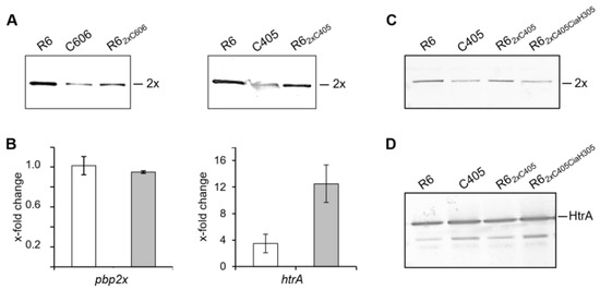 The gene encoding the serine protease HtrA is strongly regulated by CiaR [38,70] and has been shown to target a GFP-tagged wild-type PBP2x and derivatives thereof [8,54]. Thus, the expression of htrA was analyzed by RT-PCR in mutants C405 and C606 in comparison to the parental strain R6. The htrA expression level was 3.5-fold higher in C405 and 12.5-fold higher in C606 compared to the parental strain R6 (Figure 3B, right). These results are in line with promoter activities of htrA measured in R6 strains carrying ciaH305 and ciaH306 alleles [36]. The protein level of HtrA in R6 and the mutants was determined by Western blotting using HtrA-specific antibodies (Figure 3D). We detected smaller, immunoreactive bands, most probably representing HtrA degradation products in C405 or R62xC405CiaH305, which were stronger compared to R6.