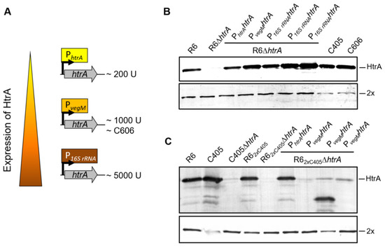 First, we evaluated the promoter activities using a promoterless E. coli lacZ as the reporter gene and a stable integration of promoter-lacZ fusions driven by the promoter probe vector pPP2 [64]. The β-galactosidase activities were measured at six time points taken throughout the growth of the culture (Figure S5). The promoter activities are illustrated in Figure 5A. PhtrA belongs to moderate expression promoters (≈200 U). The constitutive promoter PvegMwas found to be a strong promoter, resulting in a similar expression level of htrA gene as in C606 (≈1000 U), whereas the P16S rRNA promoter was five times stronger than the PvegM promoter.