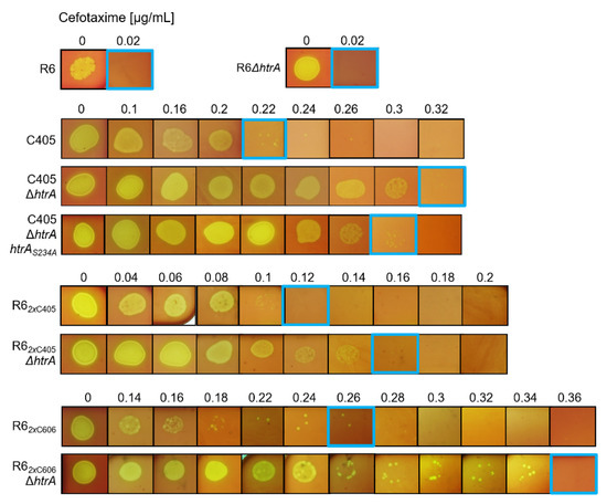 Effect of HtrA on PBP2x-mediated cefotaxime resistance. S. pneumoniae strains were grown in C+Y medium to a cell density of N 30, diluted, and spotted on D-blood agar plates containing narrow concentrations of cefotaxime (0.02 (µg/mL) steps). The plates were incubated for 48 h at 37 °C. A representative result of five independent experiments is shown. The spots in blue frame correspond to the defined MIC values.