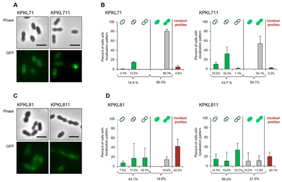 In most of the KPKL71 cells (80.3%), the fluorescence signal of GFP-PBP2xC405 was detected in the cytoplasm, and only a small fraction of KPKL71 cells (14.9%) showed a clear septal localization (Figure 7). The amount of septal localization of GFP-PBP2xC405 fusion protein in KPKL81 was much higher (43.1%). The deletion of the serine protease HtrA gene (KPKL711 and KPKL811) correlated with the fact that the fusion protein GFP-PBP2xC405 was no longer degraded, resulting in a correct septal or equatorial localization. Thus, the small amount of GFP-PBP2xC405 is always located in the region where it is most urgently needed—at the cell septum. In our previous study, we revealed that HtrA targets the functional full-length GFP-PBP2x fusion [8]. These experiments verified that HtrA also targets GFP-PBP2xC405 allele that is structurally distinct from the wild-type PBP2x.