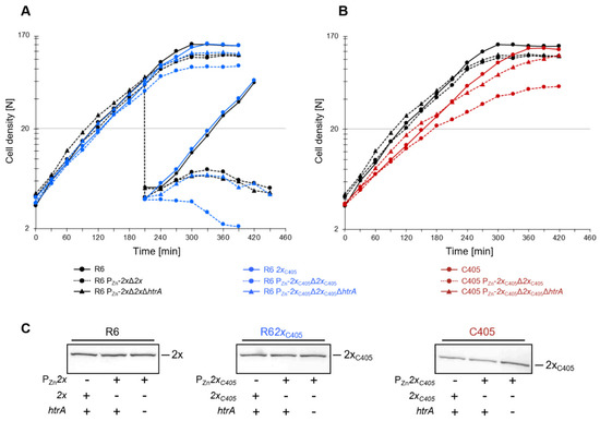 HtrA targets altered PBP2x. Effect of htrA deletion on PBP2xC405 in (A) R62xC405 (in blue) and (B) C405 (in red) backgrounds. R6, DKL41 (R6 PZn-2xΔ2x), and DKL411 (R6 PZn-2xΔ2xΔhtrA) were used as controls (in black). Strains were grown in the presence of the 0.09 mM ZnCl2, pelleted, washed, and diluted 1:20 in C+Y medium without ZnCl2. When cell density reached N = 70, the cells were diluted 1:20 (vertical dashed line), except for DKL61 (C405 PZn-2xC405Δ2xC405) and DKL611 (C405 PZn-2xC405Δ2xC405ΔhtrA) due to poor growth under these conditions. Further used strains: DKL51 (R6 PZn-2xC405Δ2xC405) and DKL511 (DKL51ΔhtrA). (C) Cells were harvested at mid-exponential growth for Western blot analysis using anti-PBP2x antibodies. The position of PBP2x or PBP2xC405 is indicated. All experiments were repeated at least 3 times with almost identical results.