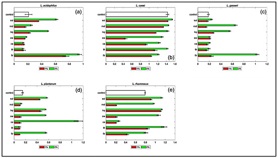 Honey is as a potential prebiotic, since it has oligosaccharides capable to promote the growth of lactobacilli and bifidobacteria, and possess antimicrobial components, which can act synergistically with the probiotics against certain pathogens [69]. Other reported benefits of the honey as prebiotics include heightened probiotic persistence in the GI tract, improved amounts of short chain fatty acids, and augmented resistance to pathogens [70,71]. The honeys were also tested to verify their effect on the growth of microorganisms with proven probiotic properties, Lactobacillus acidophilus, Lacticaseibacillus casei, Lactiplantibacillus plantarum, Lactobacillus gasseri, and Lacticaseibacillus rhamnosus. The results are shown in the Figure 1a–e.