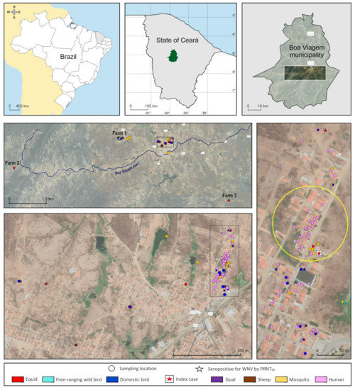 Locations where humans, domestic animals, free-ranging wild birds, and mosquitoes were sampled and tested for WNV in Boa Viagem in 2019. Equids from Farms 2 and 3 had a history of staying at the same property of the index case. Bright yellow circle marks the area where the households of WNV-seropositive humans are located. Seropositive residences are not identified for ethical reasons.