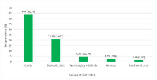Seroprevalence for WNV by PRNT90 in groups of hosts sampled in September 2019 in Boa Viagem, CE.