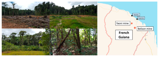 Illustration of some examples of different stages of ecological restoration on former Guyanese gold mining sites and geographical location of the Yaoni and Belizon mines in French Guiana. Non-restored site (top left), ecological restoration with herbaceous species after 3 years ((top right), Lyc), ecological restoration with fabaceous species after 3 years ((bottom left), Cli), ecological restoration with fabaceous species after 18 years ((bottom right), Mix). The pictures were taken during a second sampling campaign in April 2016 at sites undergoing ecological restoration.