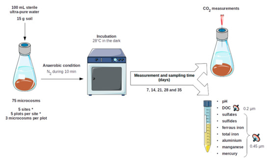 The microcosms obtained were mixed with sterile spatulas and sealed with a butyl/PTFE shield cap (VWR©). Anoxic conditions were then initiated by flushing microcosms with N2 for 10 min. The microcosms were incubated in the dark at 28 °C for 35 days without shaking. The measurements were taken on days 7, 14, 21, 28 and 35. Then, 8 mL of medium culture was collected with a sterile syringe through the butyl/PTFE shield cap, which was then analyzed for pH and the following concentrations in solution: sulfates, sulfides, ferrous iron, total iron, aluminum, manganese and mercury. The preparation of the experimental set-up is described in Figure 2 below.
